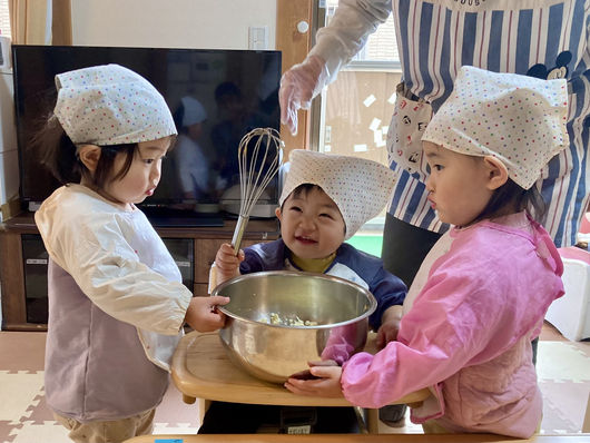 ✿お部屋の隣のキッチンからは、調理員さんが作るおいしい給食の出汁の香り、トントンと野菜を切る音が聞こえてきます。できたておいしい給食が自慢です!